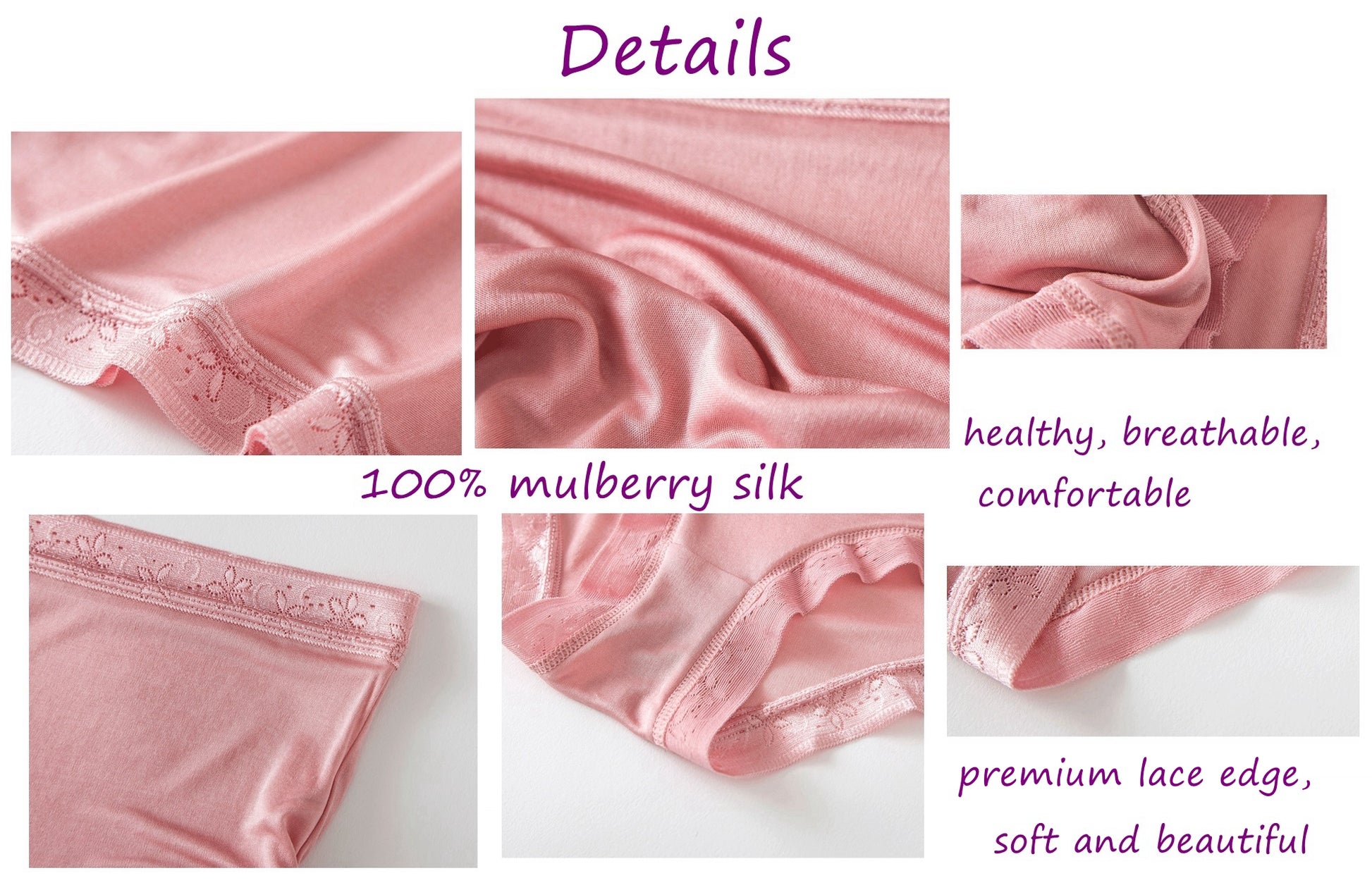 🌸 The pantie is made of 100% mulberry silk, 6A grade, super soft, lightweight, and comfortable for all-day wearing, you can even not feel it. Mulberry silk contains 18 amino acids and collagen that may be directly absorbed into the skin.